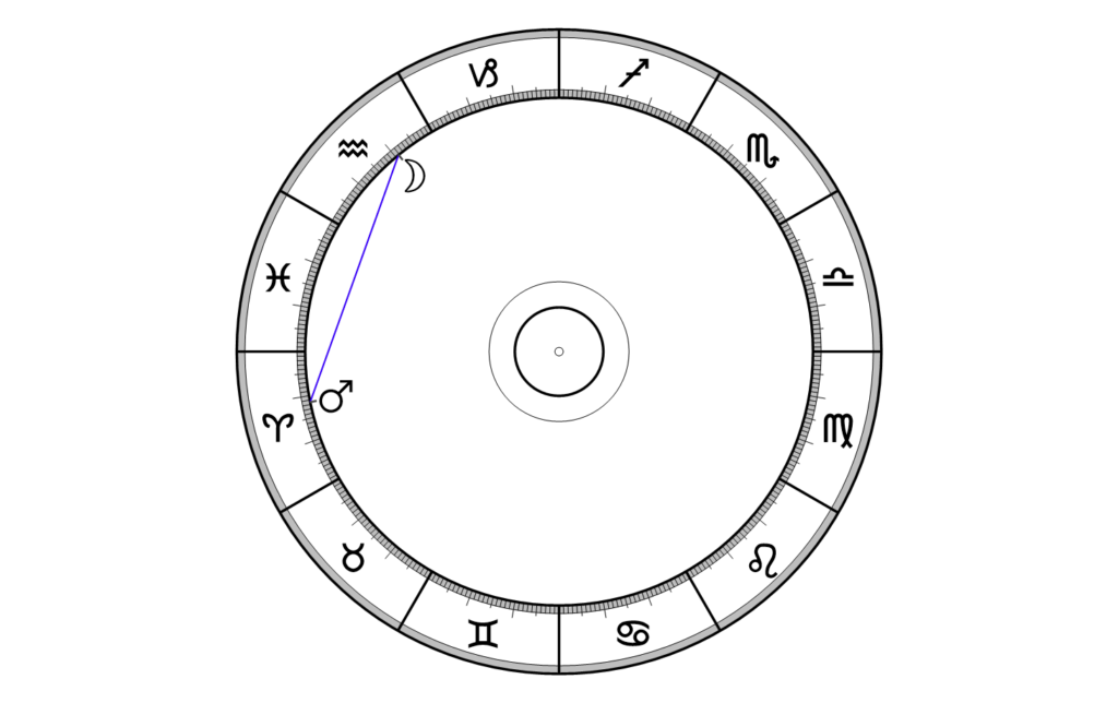 Im unteren Bild wird ein Sextil zwischen Mond und Mars dargestellt als Beispiel. Mond und Mars sind 60 Grad und somit zwei Tierkreiszeichen voneinander entfernt.